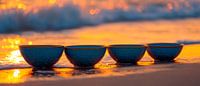 De golf glijdt zachtjes over de kleurrijke schalen, terwijl het gouden licht het zand kust. De harmonieuze opstelling van deze schalen straalt rust en sereniteit uit. Perfect voor een stijlvolle woonkamer of een creatieve keuken, dit beeld nodigt je uit om je zintuigen te verwennen en de geneugten van het leven te vieren.