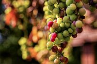 Een rijpende tros druiven in de late middagzon met warme tinten.