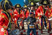 Carnavalsoptocht in Arrecife-Lanzarote met een groep percussionisten als piraat verkleed