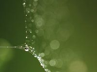 Druppels in een spinnenweb. Door te focussen op slechts 1 druppel zijn de andere druppels lichtbolletjes geworden. Zo ontstaat een meer abstract, kunstzinnig beeld.
