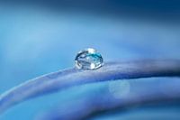 Een close-up foto van een druppel op een blaadje. De foto is een blauwe kleurtoon. Met de beperkte dof is het een rustig en minimalistisch beeld.