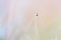 Macro opname van een waterdruppel op een enkel vruchtje van de Paardenbloem (Taraxacum officinale). De foto heeft een pastelkleurige achtergrond.