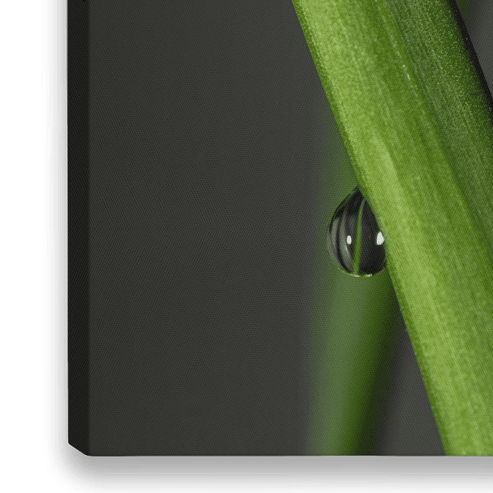 Deze macrofoto is een esthetisch beeld van 2 druppels op een kamerplant. Ik denk dat het mooi past in een minimalistisch interieur.
