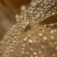 "Druppels gevangen in het web van een morgenster (Tragopogon)" is een extreme macrofoto van waterdruppeltjes die hangen aan een van de pluisjes van een morgenster (Tragopogon). Om een mooi abstract beeld te krijgen, heb ik de instellingen zo gekozen dat slechts een paar druppels haar scherp zijn en daarachter (en daarvoor) de scherpte overgaat in onscherpte (vager worden). Dit geeft een beeld waar realiteit lijkt over te gaan in een soort droom - (een abstracte) fantasiewereld.