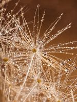 "Druppels in schitteren in het licht (met warme kleuren!)" is een macrofoto van waterdruppels op de pluisjes van een paardenbloem. Deze bewerkte foto heeft pastel kleuren / wit / goud kleur / champagne kleur/ oranje/ okergeel / bruin / beige tinten (warme kleuren).