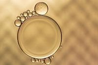 Abstracte kunst van oliedruppels op water met een kleurrijke achtergrond.