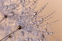 "Druppels op een pluisje vervagen in de pluizenbol" is een (extreme) macrofoto van een pluisje van een paardenbloem (op een pluizenbol), met een zalmkleurige - oranje achtergrond / ondergrond. Aan het pluisje hangen waterdruppeltjes.