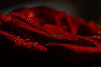Een macrofoto van waterdruppeltjes op een roos. Je ziet mooi de gelaagdheid van de bladeren van de roos met de druppels. Op de achtergrond vormen de druppeltjes een mooie bokeh.
