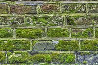 De regen heeft zijn sporen nagelaten op deze gemetselde muur in Amersfoort. De stenen en het voegwerk zijn nog vochtig en op het mos hangen kleine waterdruppeltjes. De rijkdom aan kleurschakeringen van de verweerde stenen en de grillige patronen van de verschillende soorten begroeiing maken dit tot een soort abstract kunstwerk,…