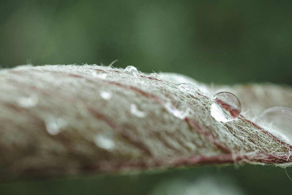 het is voorjaar, en deze bladeren zijn nu aan het uitspringen. Door het vochtige weer zijn ze nog bedekt met kleine druppeltjes, en op de achtergrond zie je de vage contouren van de eerste bloemen