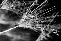 "Druppels op een witte dandelion (zwart-wit)" is een macrofoto van de pluisjes van een paardenbloem . Op de pluisjes van de paardenbloem zitten kleine druppeltjes water.