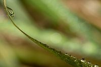 Druppels op grasspriet. De gekrulde grasspriet loopt van rechtsonder naar linksboven. De druppel linksboven is scherp, en ook de haartjes van de grasspriet zijn duidelijk zichtbaar. In die grote druppel zijn de grassprieten die erachter staan scherp te zien. Verder is er door het gebruik van een vintage lens een kleine scherptediepte…