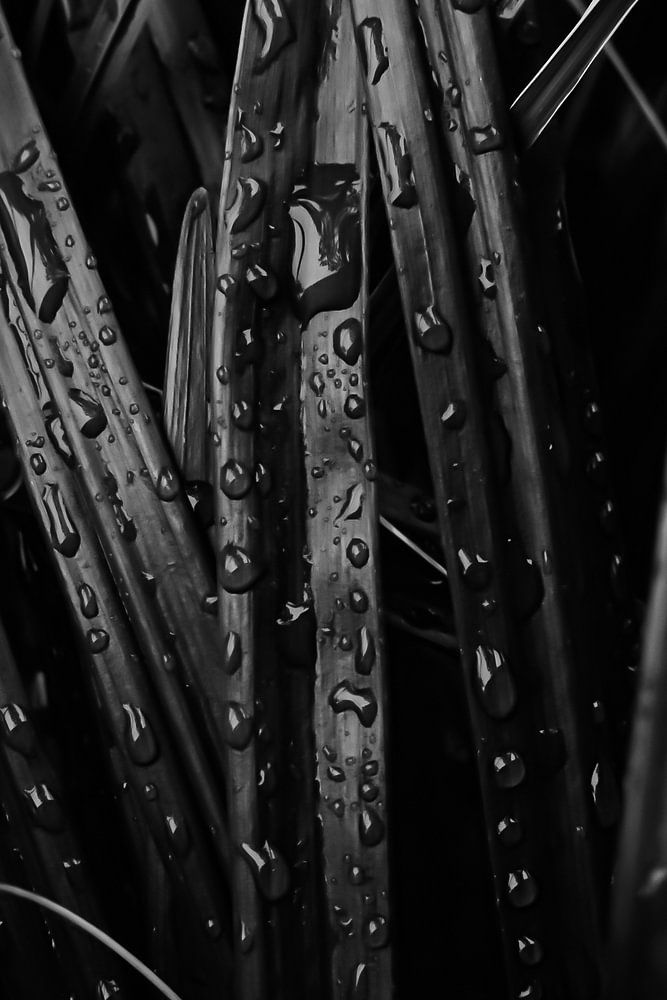 Een close-up van grashelmen na een zware stormachtige regenbui. Een beeld in zwart-wit waarbij de schaduwen van overtrekkende wolken een ritmisch hard lijnenspel tonen waarbij de regendruppels voor zachte toetsen zorgen. Het beeld past niet alleen in een landelijk interieur, maar ook in een meer industriële en sobere setting door de metaalachtige kleuren.