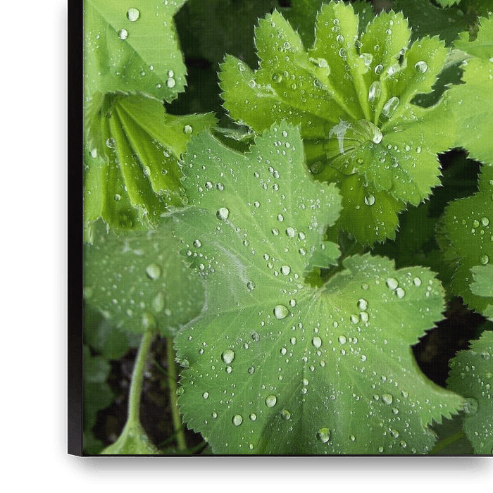 Na de regen blijven waterdruppels liggen op de groene bladeren van deze plant.