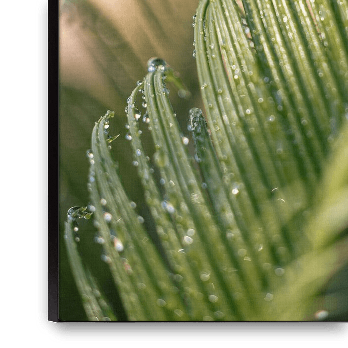 Koop de foto Druppels op het palmblad | Botanische print | van Marika Huisman fotografie op canvas, aluminium dibond, (ingelijste) fotoprint, behang en ArtFrame, op maat geprint in Fine-Art kwaliteit.