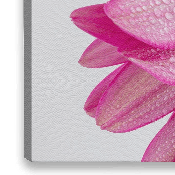 Druppels op de achterkant van een gerbera. Foto is gemaakt in een lichttent en de waterdruppels zijn erop gesproeid. De waterdruppels voegen iets extra's toe aan de foto. Het geeft het gevoel van een delicaat geheel.