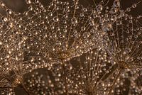 "Druppeltjes hangend aan "het web" van de morgenster" is een macrofoto van waterdruppels op de pluisjes van een morgenster van schuin onderaf gefotografeerd. Deze bewerkte foto heeft champagne kleur/ sepia / bruin / beige tinten. De achtergrond verloopt van licht naar donker.