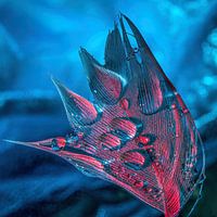 Een macrofoto van een vogelveertje toont een prachtige close-up van de fijne, delicate vezels. Het veertje heeft een elegante kromming die doet denken aan de vorm van een vis, bijna alsof het door het water zou kunnen glijden. Op het veertje rusten kleine waterdruppels die het licht vangen en schitteren. De belichting zorgt voor een…