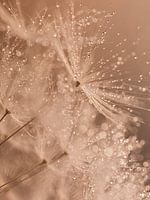 "Druppeltjes schitteren in het warme licht (pastelkleur)" is een macrofoto van waterdruppels op de pluisjes van een paardenbloem van schuin onderaf gefotografeerd. Deze bewerkte foto heeft pastel kleuren / wit / goud kleur / champagne kleur/ bruin / beige tinten.