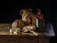 Een stilleven met vers gebakken zuurdesembroden, sneden brood, Franse kaas, een oud mes, een aardewerk kruik en een oude tinnen kan op een oude houten kist