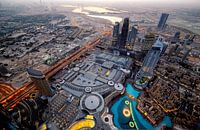 Dubai Mall van bovenaf. Terwijl de zon opkomt, zijn sommige van de fonteinen nog steeds verlicht.