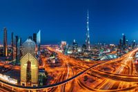 Blauw uur op een van Dubai's drukste kruispunten.