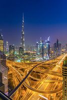 Deze foto met uitzicht op de Burj Khalifa en Downtown Dubai is gemaakt op een avond in oktober 2016. De foto is gemaakt vanaf een rooftop van een gebouw langs de Sheikh Zayed Road. Deze weg is de hoofdweg van Dubai en vanaf het punt waar vandaan de foto is gemaakt, heeft deze weg mooie vormen en lijnen.