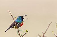 Dubbelbandige Sunbird (Cinnyris afer) zitstokken op een tak in Amakhala Game Reserve, Oost-Kaap, Zuid-Afrika.