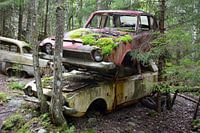 Foto's van een sloop van klassieke auto's in het bos in Zweden