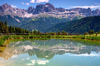 Reflectie van de Rosengarten en Valolet in een vijver in de Dolomieten.