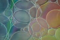 Foto met dubbele belichting van olie op water en een gekleurde achtergrond.