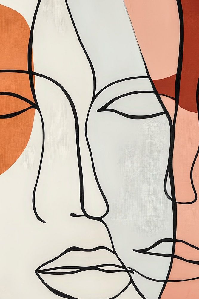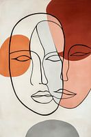 Deze elegante combinatie van zachte aardetinten en strakke lijnen straalt een gevoel van rust en reflectie uit. De gestileerde gezichten lijken met elkaar in gesprek en creëren een diepe sfeer. Dit kunstwerk, dat ideaal is voor een moderne woonkamer, springt gegarandeerd in het oog en nodigt uit tot verpozen en nadenken.