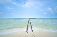 Oude, houten dubbele golfbreker in het IJsselmeer voro de kust van Hindeloopen in Friesland.