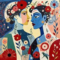 Dit schilderij is een viering van verbinding, dualiteit en de complexe schoonheid van de natuur. Als kunstenaar wilde ik de essentie van twee vrouwen vastleggen, waarbij hun profielen elkaar weerspiegelen en harmonie en contrast symboliseren. Hun gezichten, de een in warm geel en roze, de ander in koel blauw, vertegenwoordigen de balans…