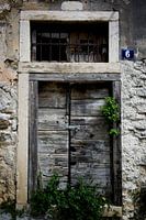 Huisnummer 6 lijkt niet bewoond. Het huisnummerplaatje lijkt het enige verzorgde onderdeel aan deze gevel. Het onkruid groeit zelfs van binnen naar buiten. Toch zit er een stevig hangslot op de deur. Wat zou er binnen te zien zijn? De deur bevindt zich in het dorpje Buje, Istrië, Kroatië.