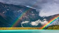Een 16:9 foto van een dubbele regenboog over Emerald Lake, gelegen in Yoho National Park, in de provincie British Columbia in het westen van Canada.