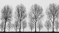 Een bewolkte lucht en lichte motregen geeft een nevelige sfeer op een dijk in de buurt van Middelharnis. De bomen met kale takken scheppen een prachtig beeld van het Zuid-Hollandse landschap waar rijen bomen de dijkwegen flankeren. Zwartwit maakt deze foto nog sterker.