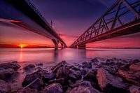 Dubbele Spoorbrug over het Hollands Diep, bij Moerdijk, tijdens zonsondergang.