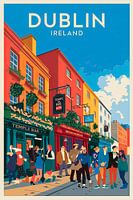 Een typische straat in Dublin schittert in felle kleuren, omzoomd met uitnodigende pubs en levendige facetten. Mensen flaneren vrolijk voorbij, terwijl de geur van vers getapt bier en culinaire hoogstandjes in de lucht hangt. De artistieke flair en karakteristieke gevels stralen een sfeer van Ierse gezelligheid en passie uit.