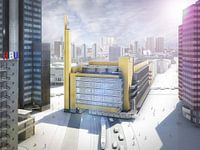 Dit beeld toont Dudok's meesterwerk op de originele locatie, omringd door hedendaagse gebouwen, als een spookverschijning het verkeer blokkerend op zowel de Coolsingel als de Westblaak.