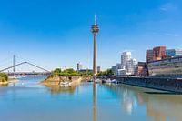 Düsseldorf Medienhafen (Mediahaven) moderne architectuur met de Rheinturm fernsehturm aan de oever van de Rijn tijdens een mooie zomerdag in Noordrijn-Westfalen, Duitsland.