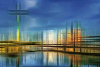 Duitsland Düsseldorf Rijnhaven met Gehry Gebouwen en Rijntoren Meervoudige belichting Abstractie