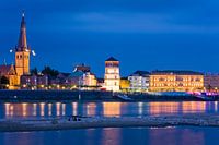 De skyline van Düsseldorf 's nachts met St. Lambertus, de kasteeltoren en de Rijnpromenade.