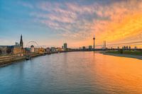 Panoramisch uitzicht vanaf de Oberkasselerbrug in de richting van de oude stad en de Mediahaven tijdens een kleurrijke zonsondergang.