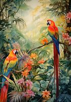 Deze kunstzinnige representatie van een jungletafereel met papegaaien is een visueel feest dat een overvloed aan kleur en leven viert. De levendigheid van de papegaaien - in schakeringen van vlammend oranje, diepblauw en verzadigd rood - vormen het middelpunt van de compositie. Hun verschijning is niet alleen een toonbeeld van natuurlijke pracht, maar dient ook als een symbool voor de exotische mysterie van de tropen.