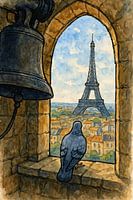 Dit schilderij toont een intiem moment: een duif zit rustig in een oude gotische klokkentoren en kijkt uit over de daken van Parijs, met de iconische Eiffeltoren als middelpunt. Het raam waarin de vogel zit, heeft een gotische boogvorm die meteen een historisch en monumentaal gevoel oproept. Een bijzonder detail is de grote bronzen klok aan de linkerkant, die niet direct de aandacht trekt, maar de scène extra karakter en authenticiteit geeft.
