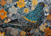 Duif - Het schilderij toont een rijk gedetailleerde duif tegen een achtergrond van sierlijke bloemen, kenmerkend door een folkloristische stijl. De uitgesproken contrasten tussen de grijze, zwarte en bloemrijke tinten wekken de illusie van levendige texturen. De warme oranje en gele bloemen bieden een aangename dynamiek tegenover het koele turquoise en blauw van de vogel.