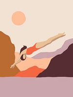 Minimalistische en kleurrijke illustratie van een vrouw die elegant in het water duikt, omringd door serene bergen en een warme ondergaande zon. De compositie straalt rust en vrijheid uit, met een harmonieus kleurenpalet van burgundy, peach, lila, koraal en roestbruin. Perfect voor liefhebbers van moderne, eenvoudige kunst met een…