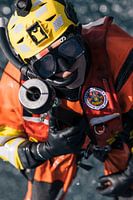 Een hangt uit een USCG Jayhawk helikopter boven zee, in de buurt van San Diego, CA.