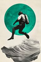Midden in een dynamische oceaan zweeft een avontuurlijke duiker bijna gewichtloos, alsof hij de grenzen van het water overstijgt. De gloeiende groene volle maan achter hem geeft de scène een surrealistisch tintje en benadrukt de moed van de ontdekkingsreiziger, terwijl de krachtige golven hem omringen en wijzen op de oneindige mogelijkheden van de zee.